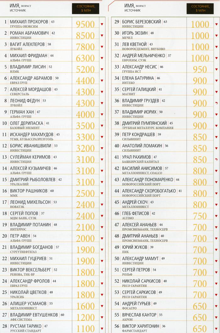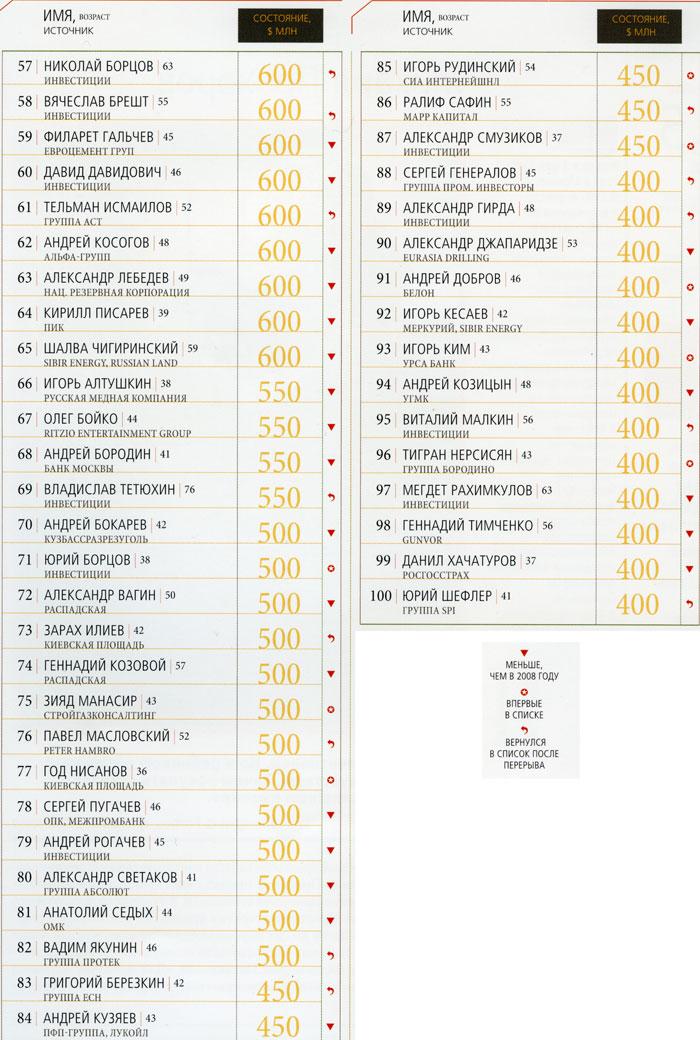 6. В список включены только 100 самых богатых бизнесменов России, нижняя планка рейтинга — состояние в $400 млн. Если вы не нашли в списке кого-либо из известных предпринимателей, значит, Forbes оценивает его состояние менее чем в $400 млн.